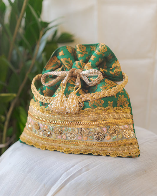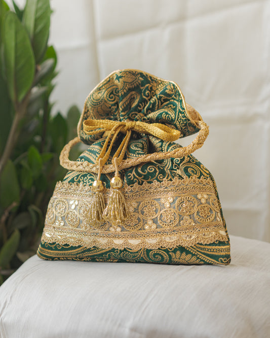 Bottle Green & Golden Banarasi Potli With Golden Broad Lace