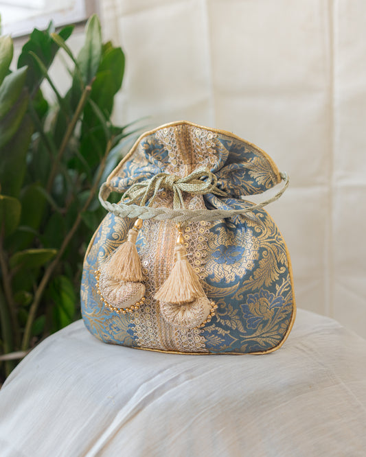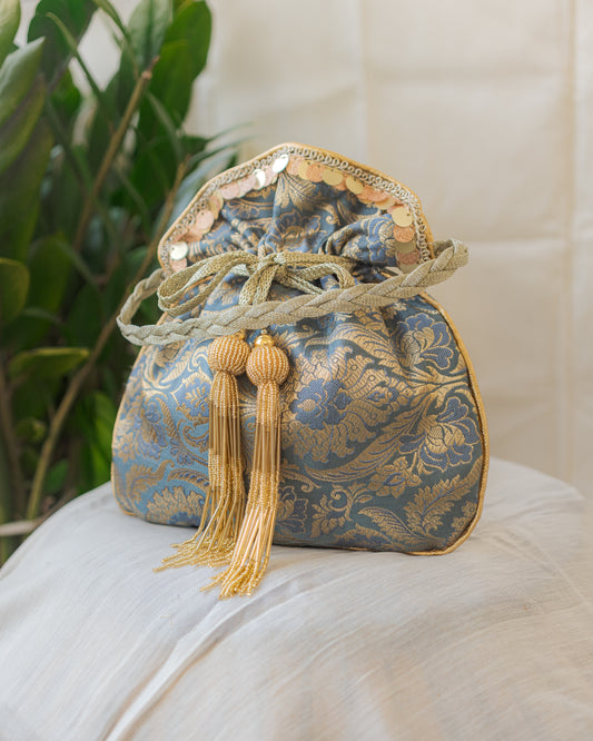 Grey & Golden Banarasi Potli With Golden Glass Tassels