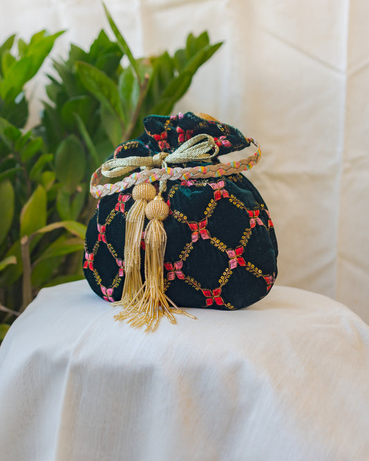 Bottle Green Velvet Potli With Golden Glass Tassels