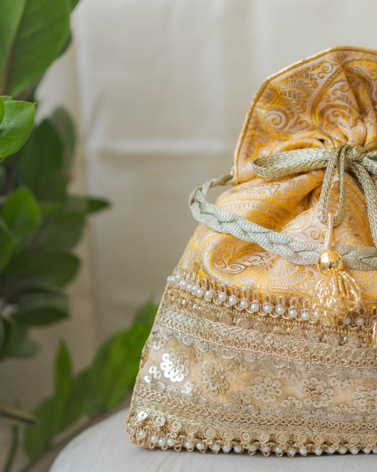 Light Yellow & Golden Banarasi Potli With Broad Sequin Pearl Lacework