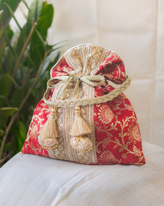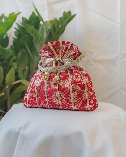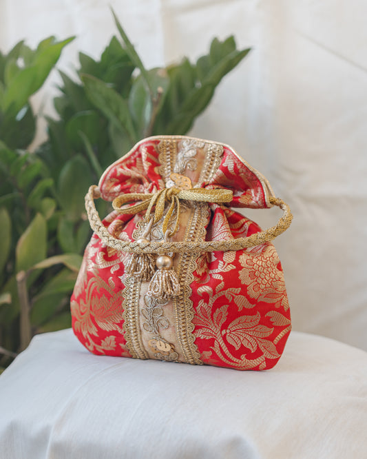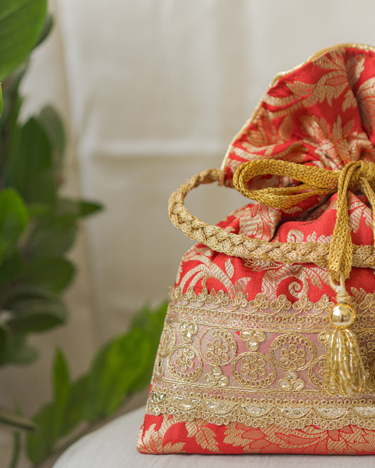 Red & Golden Banarasi Potli With Golden Broad Lace