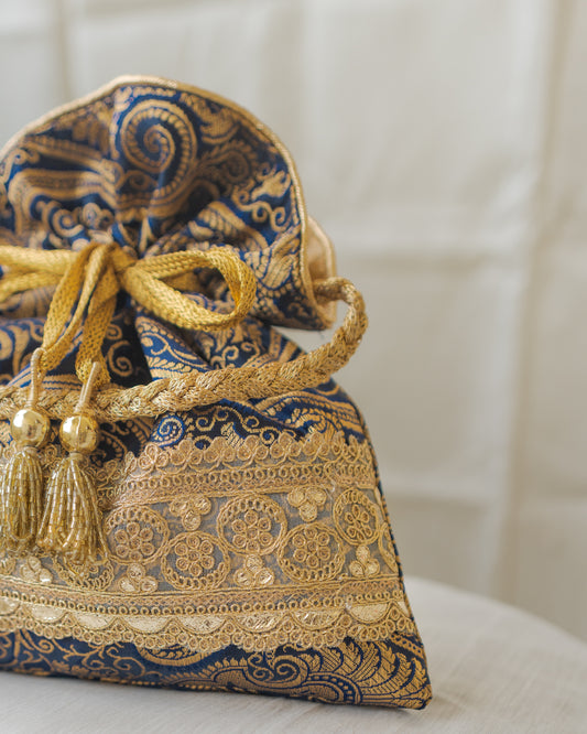 Navy Blue & Golden Banarasi Potli With Golden Broad Lace