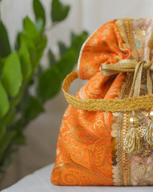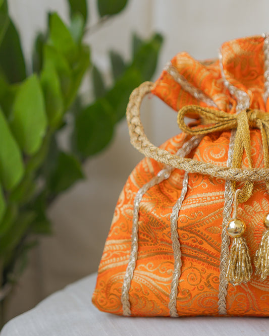 Pumpkin Orange & Golden Banarasi Potli Bag With Broad Lace