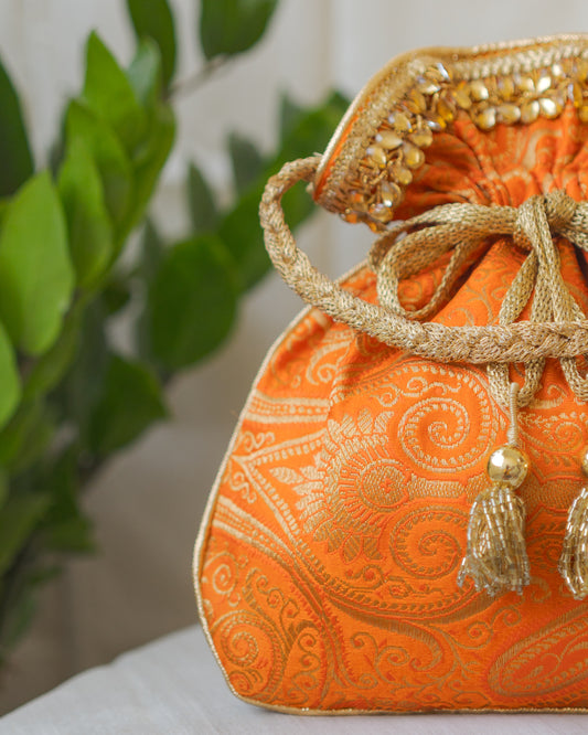 Pumpkin Orange & Golden Banarasi Potli With Glass Tassels