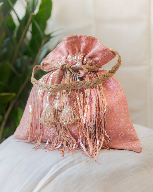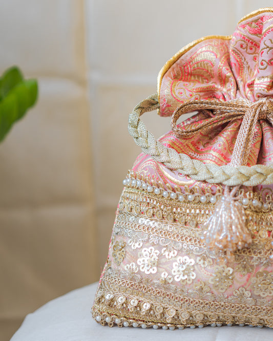 Peach Pink & Golden Banarasi Potli With Broad Sequin Pearl Lacework