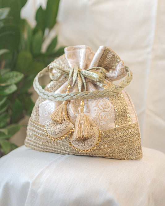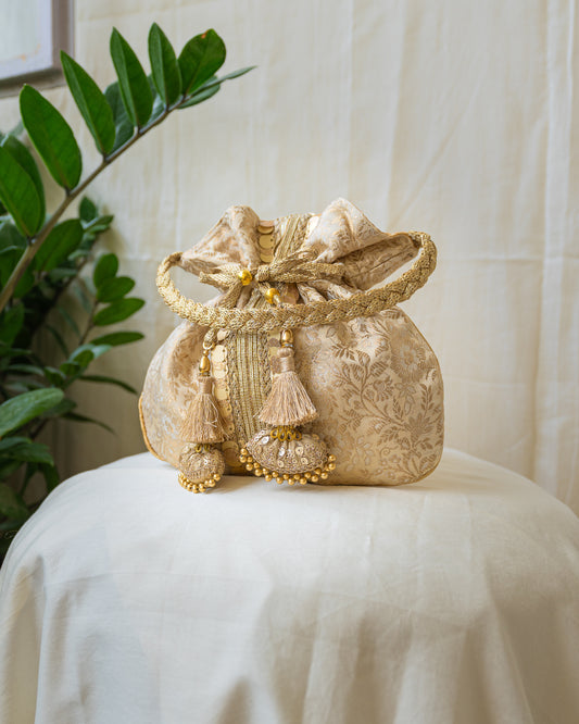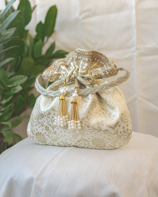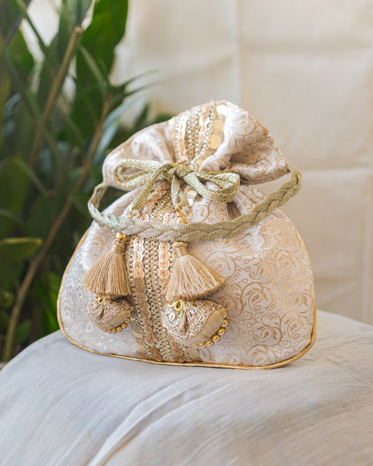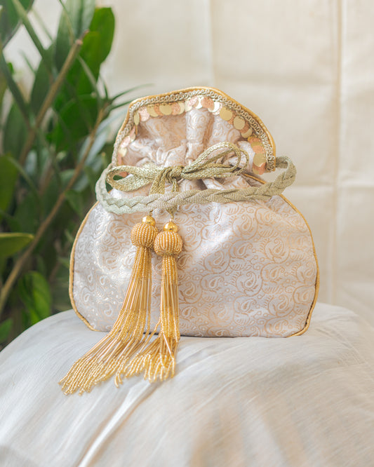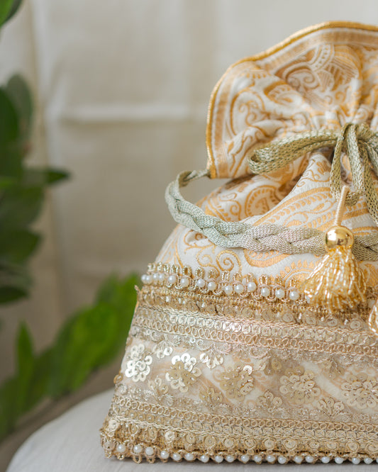 Off White and Golden Banarasi Potli With Pearl Tassels