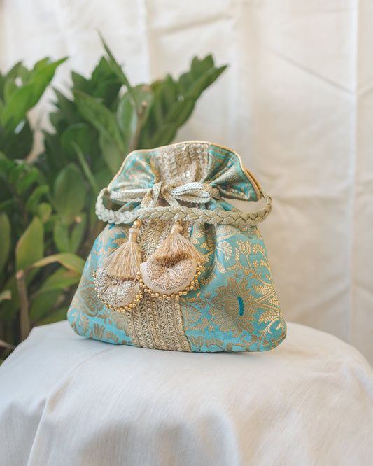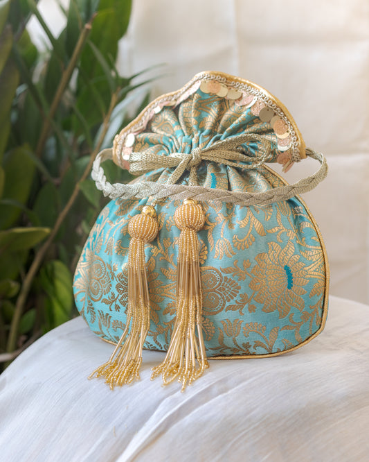Sage Green & Golden Banarasi Potli With Glass Tassels