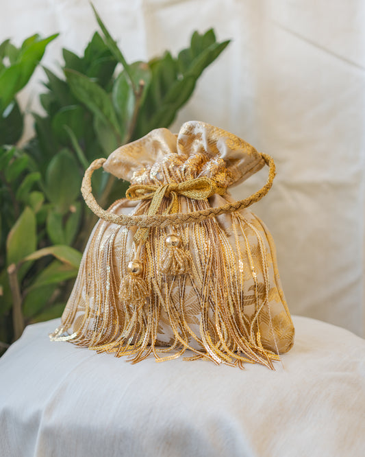 Chikoo Golden Banarasi Potli With Sequin Lace & Glass Tassels