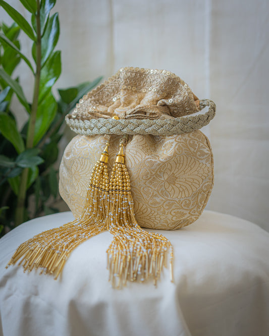 White & Golden Banarasi Potli With Golden Glass Tassels