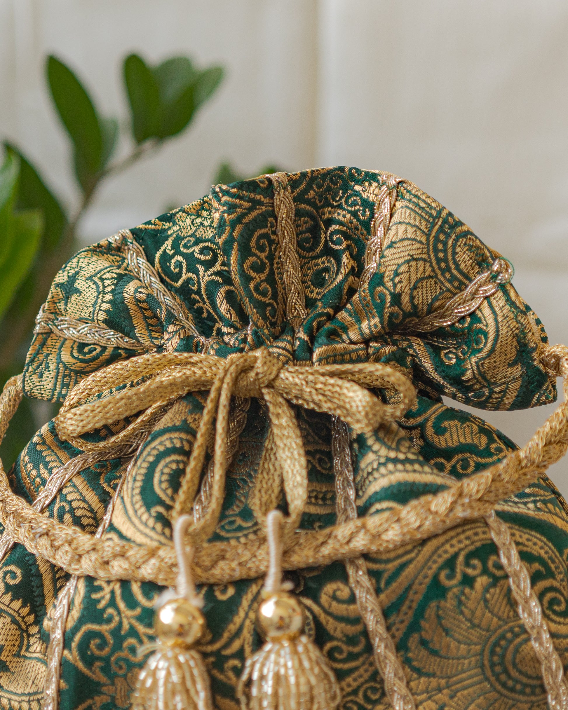 Product Details - Bottle Green & Golden Banarasi Potli with Golden Glass Tassels.