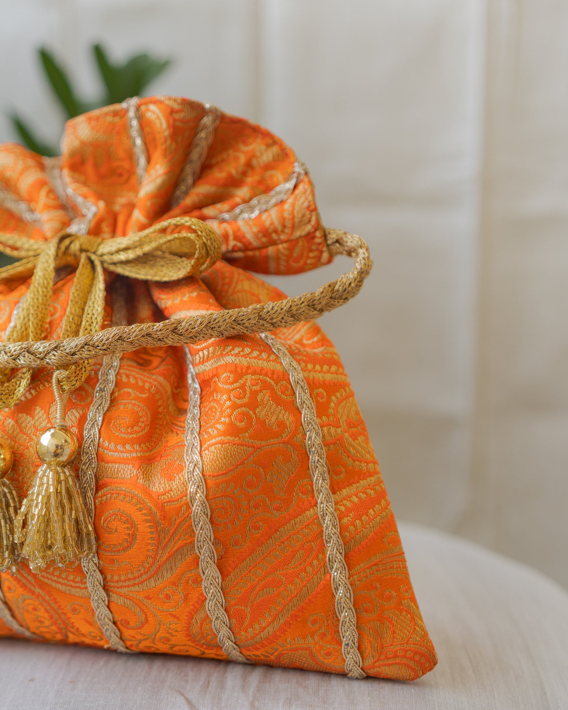 Product Details - Pumpkin Orange & Golden Banarasi Potli with Golden Glass Tassels.