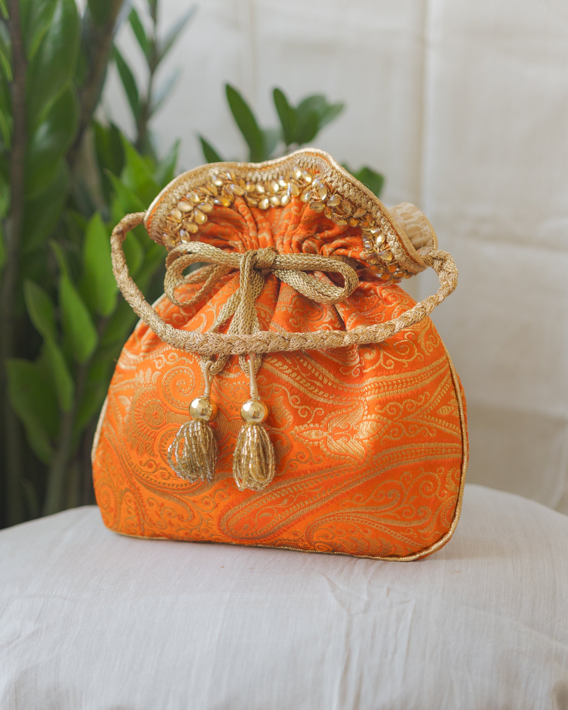 Pumpkin Orange & Golden Banarasi Potli With Glass Tassels