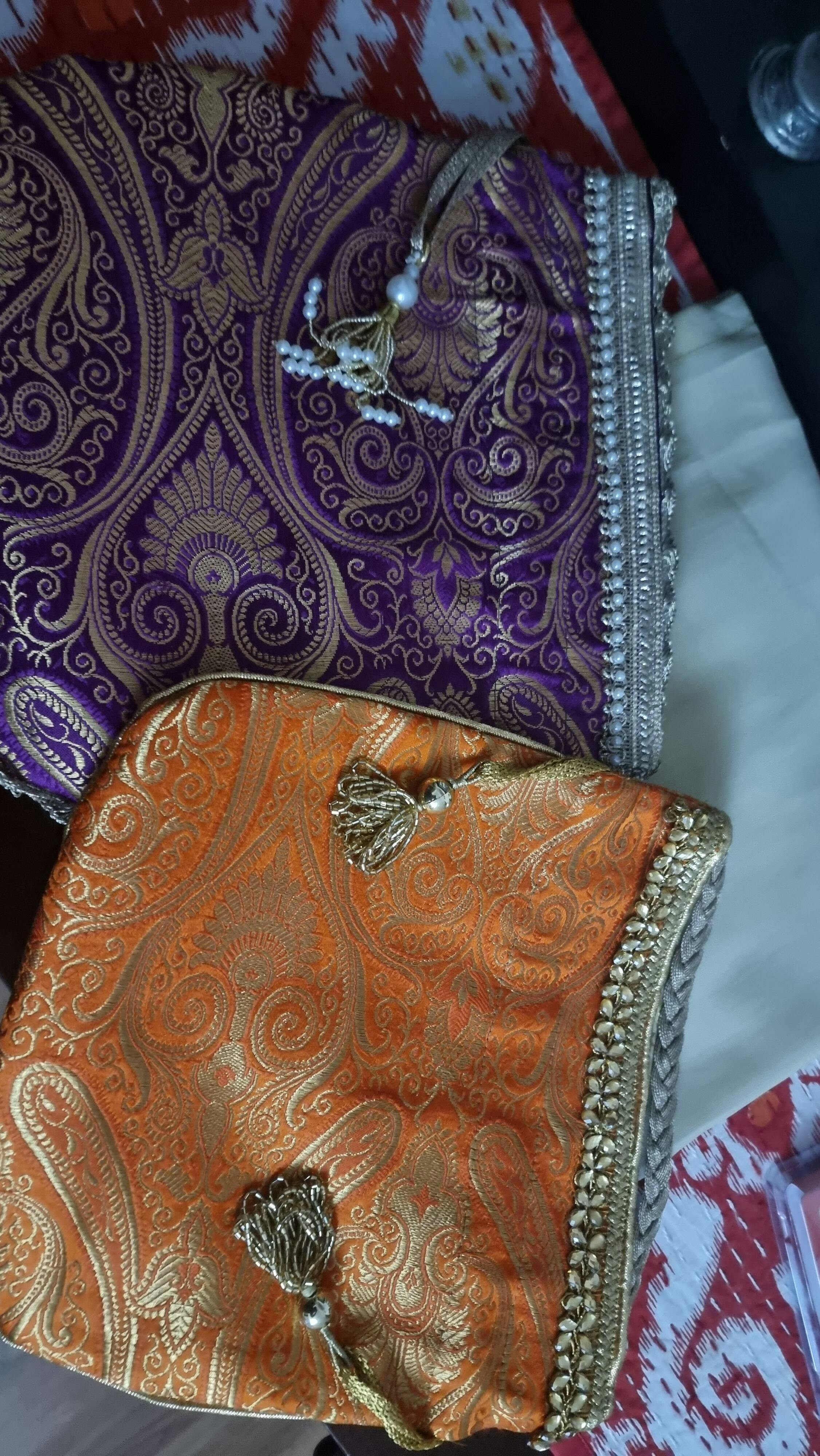 Product Details - Purple and Golden Banarasi Fabric Potli, Pearl Lacework and Golden Pearl Tassels