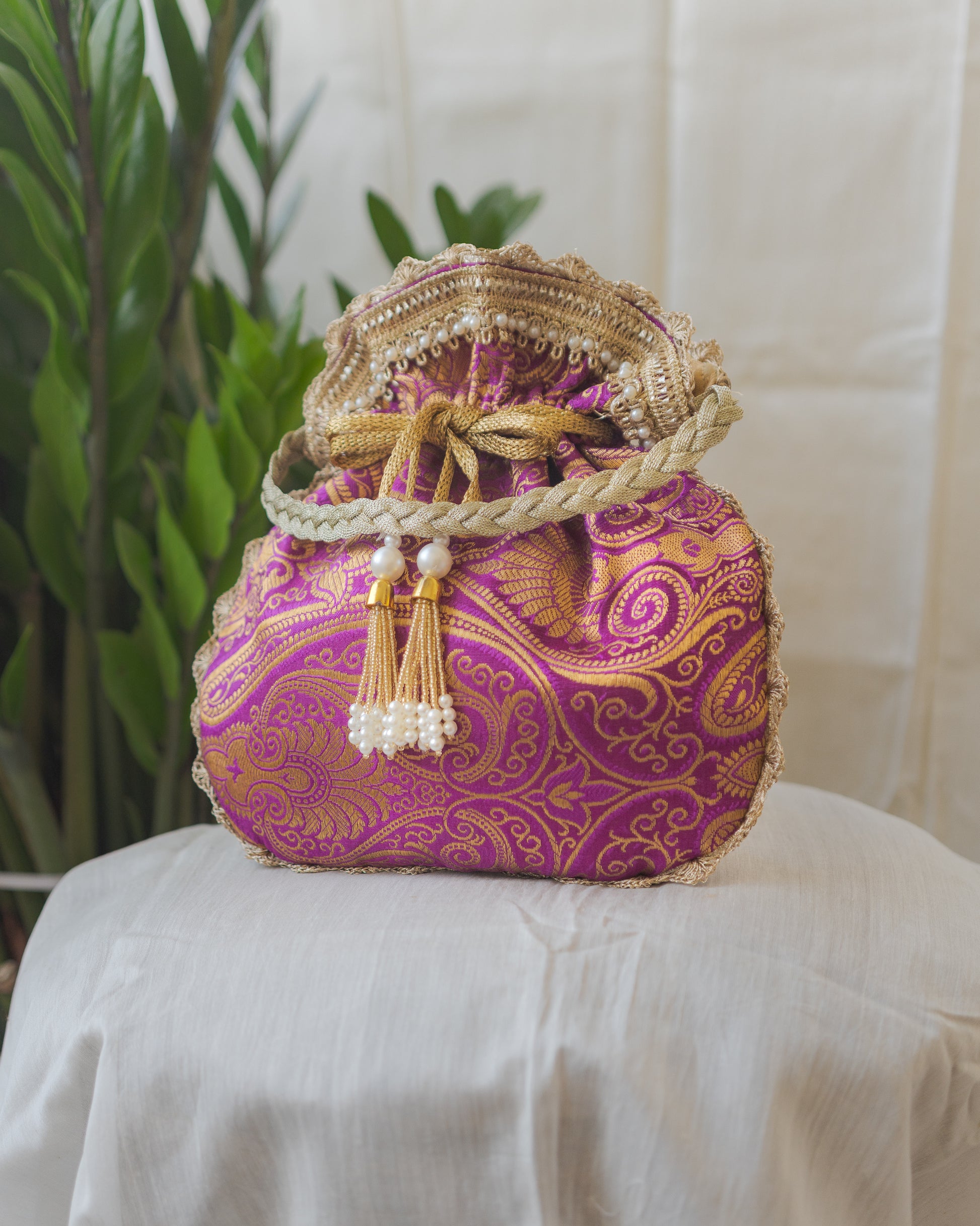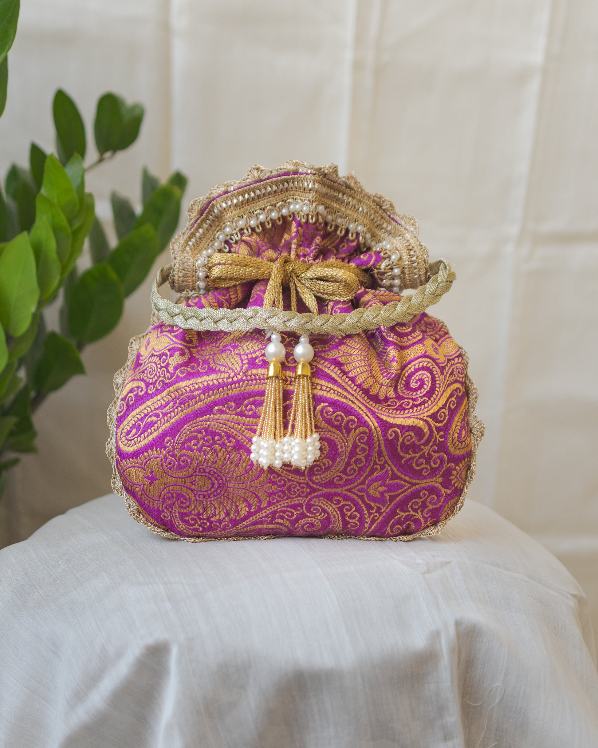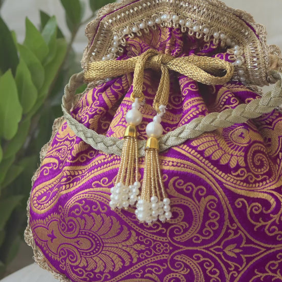 Purple & Golden Banarasi Potli With Pearl Tassels