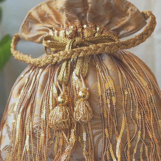 Color - Off White & Golden Brocade Fabric, Golden Sequins, Golden Tassels.